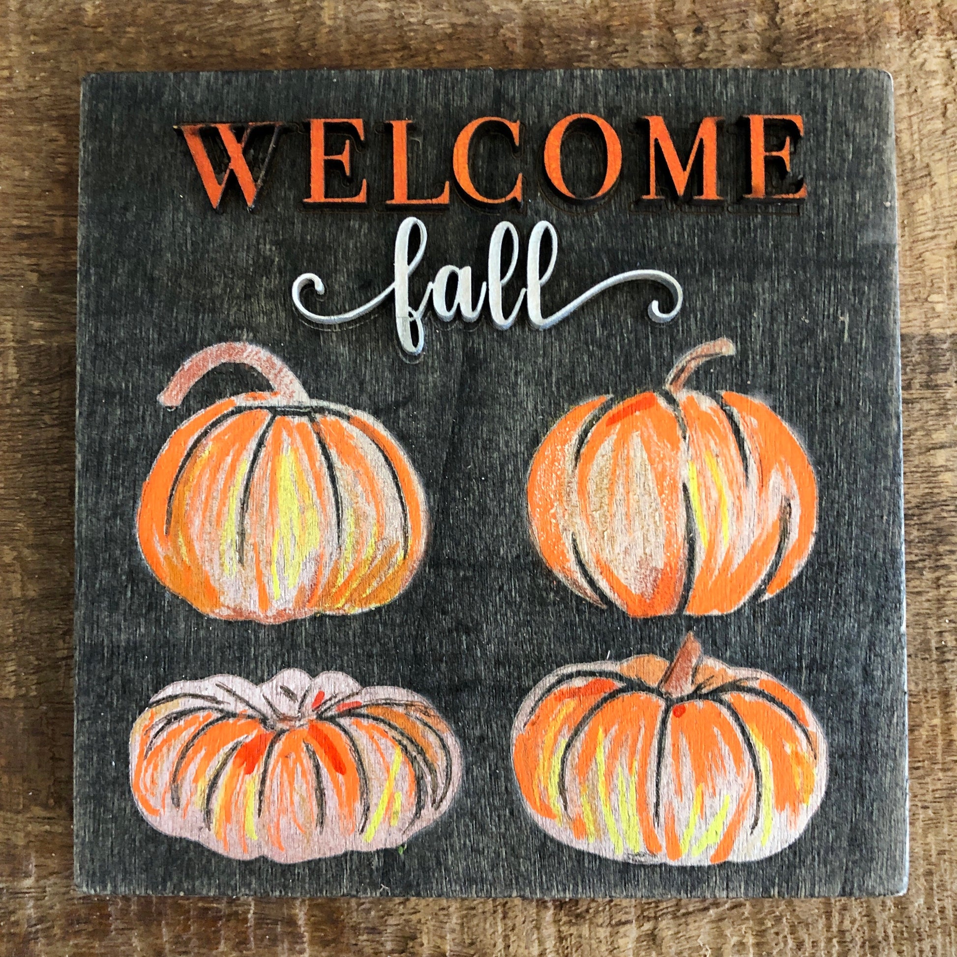 Welcome Fall: Handmade wall art, home decor for Autumn & Fall. This cute little wooden wall hanging is a tasteful way to decorate your home for the October and November holidays.
