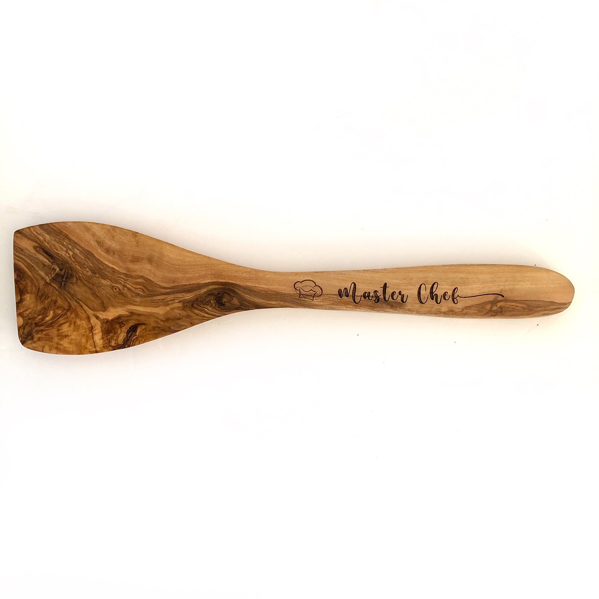 Sturdy wooden spatula made from olive wood for cooking, stirring, serving or mixing. Laser engraved with the words Master Chef. This durable wooden kitchen utensil makes the perfect house warming gift, host & hostess gift or birthday gift for your foodie friends.
