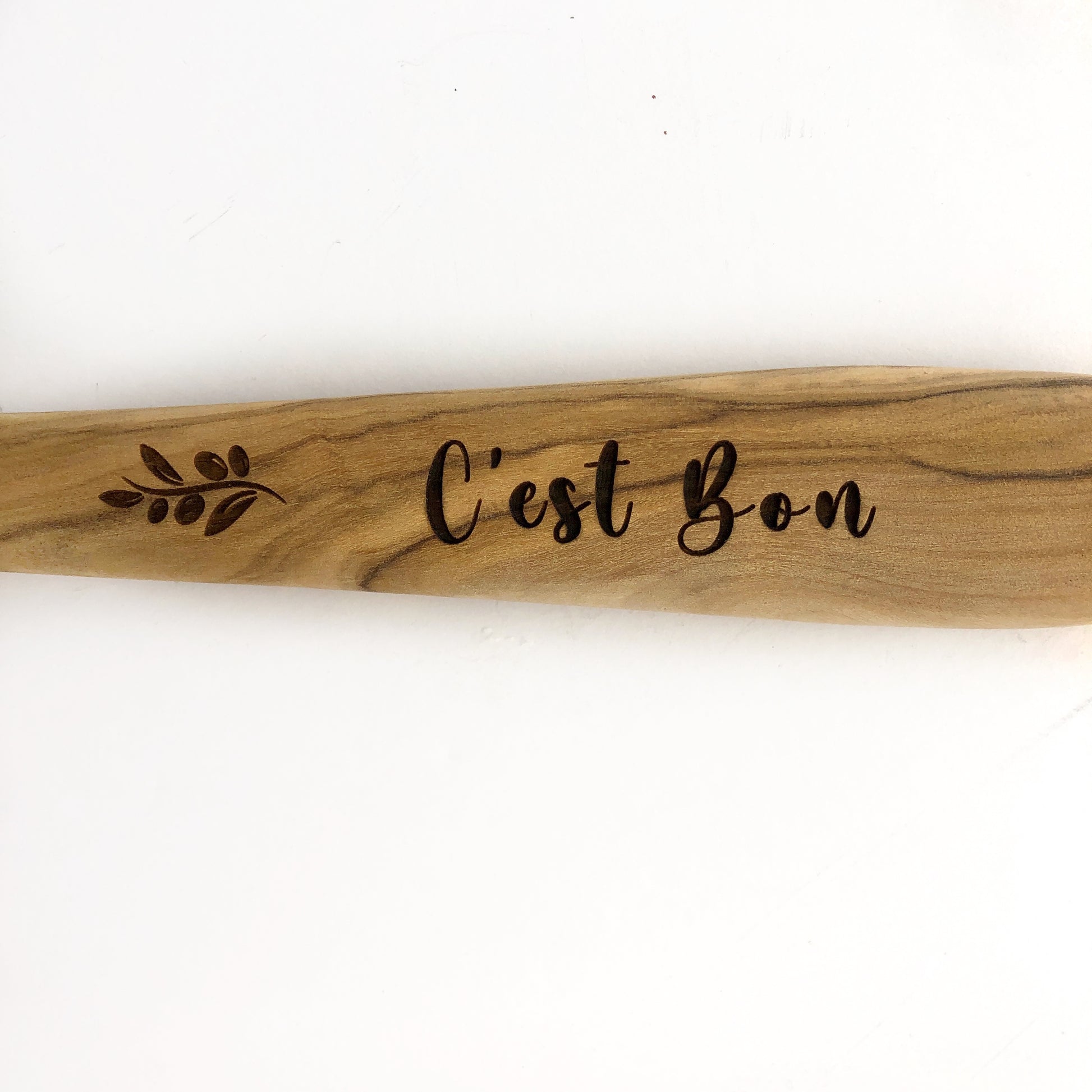 Set of two French themed wooden kitchen utensils made from olive wood and engraved with the French words Bon Appétit and C'est Bon. Perfect for cooking, stirring, serving or mixing. Set includes one wooden spoon and one wooden spatula. Add a French vibe to your own kitchen or give them as a cute house warming gift, host-hostess gift or birthday gift to your foodie friends. The hole drilled into the handle makes it easy to hang up and looks great on it's own as wall art.